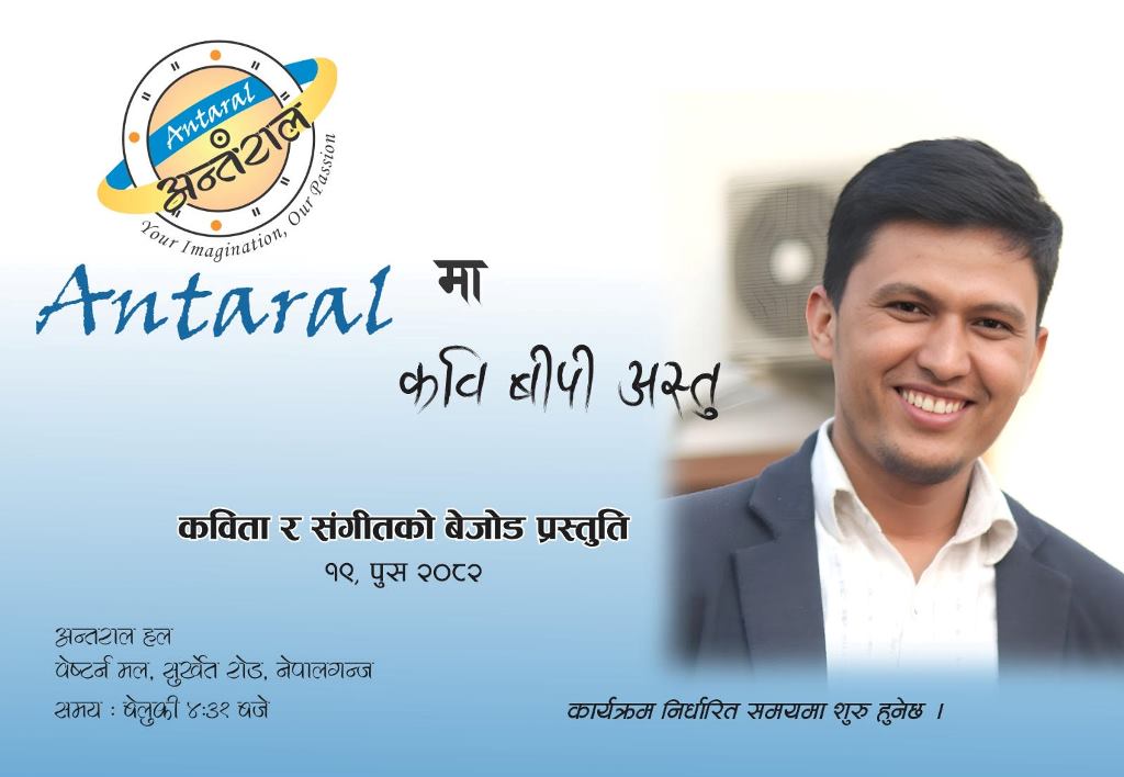 नेपालगन्ज : नेपालगन्जमा पार्श्वसंगीत सहित कविता प्रस्तुतिको कार्यक्रम आयोजना हुने भएको छ। अन्तरालले कवि बीपी अस्तुका एक दर्जनबढी कविताहरू पार्श्व संगितसहित प्रस्तुत गर्ने कार्यक्रम आयोजना गर्न लागेको हो । उक्त कार्यक्रम पुस १९ गते शनिबार आयोजना हुनेछ । प्रभावकारी र एकाग्रतापूर्ण वातावरणमा कविता प्रस्तुतिले कार्यक्रमलाई स्मरणीय बनाउने गरी तयारी भैरहेको अन्तरालका प्रमुख कार्यकारी जयनारायण शाहले जानकारी दिए ।